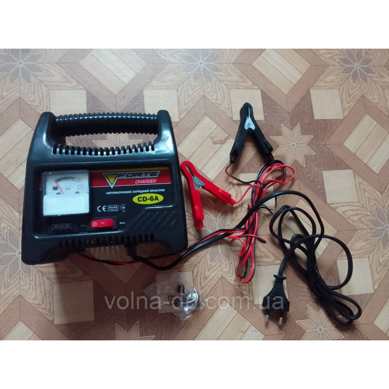 Зарядний пристрій Forte CD-6A — це добрий компактний переносний зарядний апарат. Корпус виготовлений з ударостійкого пластику, що гарантує захист зарядного пристрою. Завдяки верхній ручці цей апарат легко транспортувати. До комплекту входить силовий шнур і щупи для найкращого монтажу. Максимальна ємність батарей — 60 А. Функція безперервного підзаряджання неабияк розширює сферу застосування. Завдяки продуманій схемі не відбувається замикання у вихідної ланцюга. Стрелочні та світлодіодні індикатори полегшують стеження за процесом.