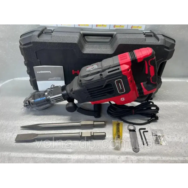 Комплектація: 1 допоміжна рукоять,1 зубило 30х410 мм, 1 плоске зубило 30х410 мм, 1 пара вугільних щіток. 1 олія, 1 тканина для очищення, 1 ключ, 1 кейс.. Штрих код: 6990001243398. Потужність: 2200 Вт. Вага: 16.6 кг. Тип живлення: Мережа. Хвостовик: HEX. Тип патрона: Ключовий. Виробник: Haisser. Країна походження: Китай. Гарантія: 3 роки. Довжина кабеля: 4 м. Клас інструменту: Професійний. Кількість ударів: 1900. Енергія удару: 60 Дж. Наявність віброзахисту: Так.