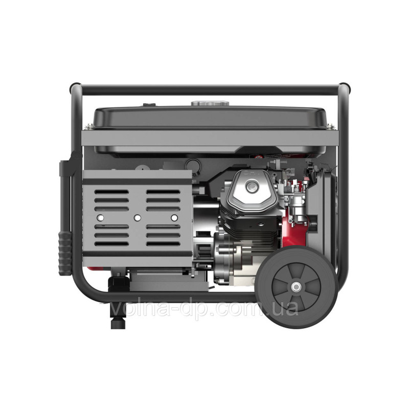 Спеціальний дисплей на лицьовій панелі генератора показує частоту та напругу в мережі, а також кількість відпрацьованих мотогодин, що дуже зручно. Додатковим плюсом є наявність клем постійного струму 12В. Коліщатка та відкидні ручки значно полегшують транспортування генератора.