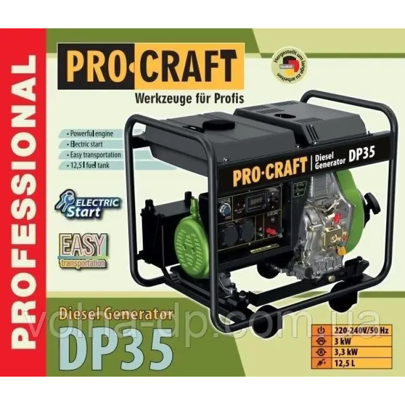 З точки зору продуктивності, дизельний генератор Procraft DP35 має об'єм паливного бака 12,5 л і максимальну витрату палива 1,25 л/год. Крім того, система запуску в нього електрична, що робить його легким у запуску та використанні. З номінальною потужністю 3 кВт і максимальною потужністю 3,3 кВт, цей генератор здатний живити низку приладів та інструментів, що робить його ідеальним для використання як у житлових, так і в комерційних приміщеннях.