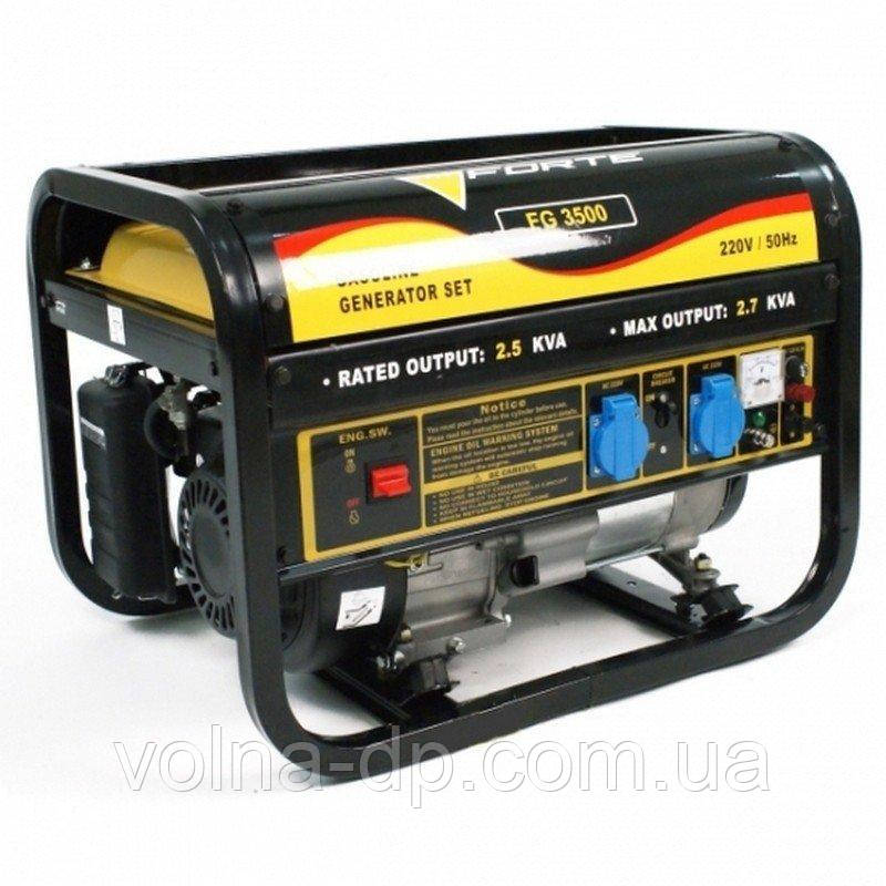 640.0 (мм) Однофазний бензиновий генератор Форте FG3500 ― професійний апарат, який призначений, як для основних, так і для резервних джерел електроенергії, для живлення споживачів в сільському господарстві, в медичних та освітніх установах, в побутових умовах, в місцях, де немає ліній електропередач або відключена електрика. Бензинову електростанцію зручно використовувати в якості сезонного аварійного джерела живлення для підключення домашнього електрообладнання, а так само будівельних інструментів. Незважаючи на малу вагу і розміри генератора, він оснащений потужним 4-х тактним бензиновим двигуном 2500 Вт, збільшеним баком до 15 л, низьким рівнем шуму (65 дБ), а так само наявністю ряду захистів для запобігання поломок або перегріву апарату. Дані технічні особливості однофазної бензинової електростанції Форте FG3500 зробили її популярною серед домовласників, дачників, будівельних бригад. Однофазний бензиновий генератор Форте FG3500 економно витрачає бензин (споживає 0,55 л/кВт-год), за рахунок чого його безперервна робота може тривати до 12-ти годин (з умовою повної заправки і навантаження генератора). Особливості: