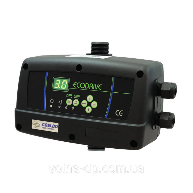 ECODRIVE іспанського виробника автоматики COELBO призначений для управління двигуном однофазного насоса. У пристрій ECODRIVE вбудований частотний перетворювач, який регулює швидкість обертання двигуна. В результаті насос підтримує постійний тиск в системі водопостачання незалежно від поточної витрати води.