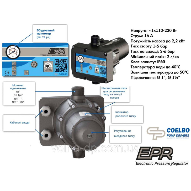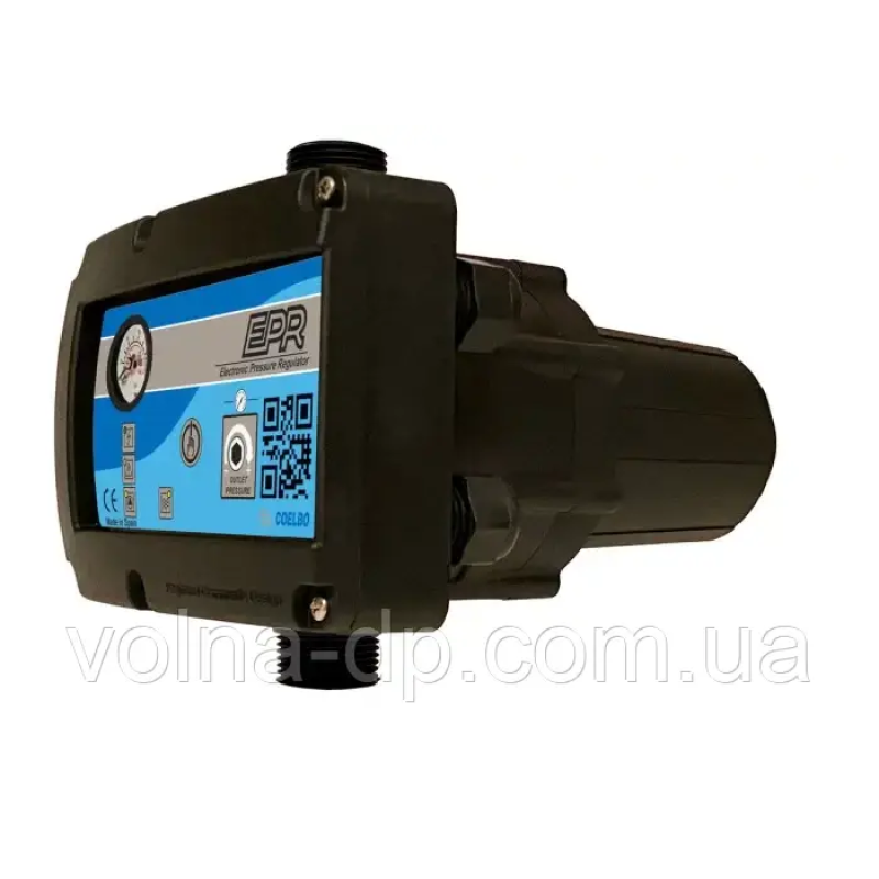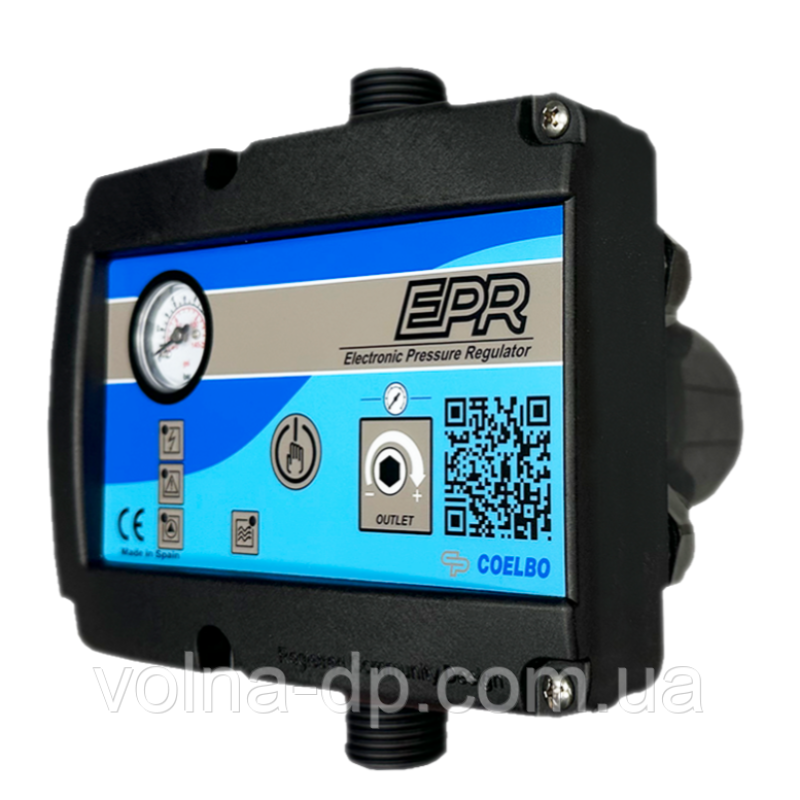 EPR Coelbo — пристрій для контролю роботи насоса за допомогою автоматичного регулювання тиску для однофазного насоса з ємністю до 2,2 кВт (1 ~ 115-230 В). Цей електронний контролер, на відміну від звичайних реле тиску, як механічного, так і електронного, здатний підтримувати постійний тиск на виході насоса. У пристрої керування EPR добре відомого іспанського виробника автоматизації для насосів використовується новітня технологія настроювання. Тиск на виході насоса може бути відрегульований вручну за допомогою шестигранного ключа. Тиск насоса виставляється кнопками на панелі керування. Ця нова технологія розділення вихідного тиску та тиску запуску насоса має чималі переваги. По-перше, кількість запусків насоса зменшується, що дає нам чимале зниження зношування насосного обладнання та фітингів, а також чималу економію енергії. По-друге, електричний насос під контролем контролера EPR працює з мінімальною різницею між тиском старту та вихідним тиском, тобто комфорт водопостачання збільшується