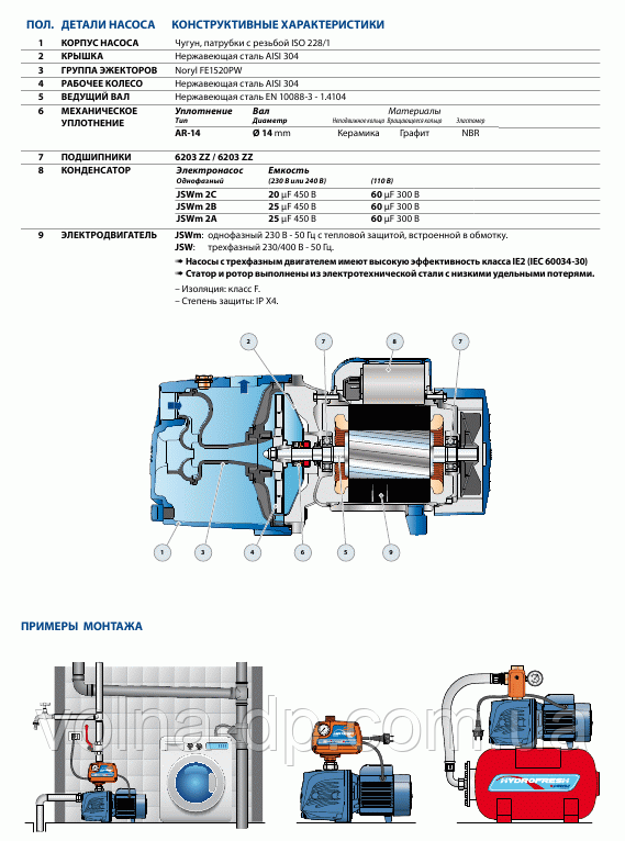 Самовсаючі насоси JSW проектовані для перекачки води навіть у повітрі змішаного з перекачованою рідиною. Завдяки їх надійності, простоті в експлуатації ці насоси можуть ефективно застосовуватися в биту, зокрема, для автоматичної подачі води разом з невеликими і середнім резервуарами автоматичною агрегатами підтримування тиску, для зрошування городів, садів і т.д.