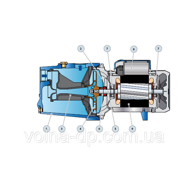 Електродвигун: насоси безпосередньо з'єднані з електродвигуном відповідної потужності; двигун асинхронний, високопродуктивний, безшумний, закритого типу з зовнішньої вентиляцією, придатний для безперервної роботи. Клас ізоляції (F до 0.90 квт однофазний)