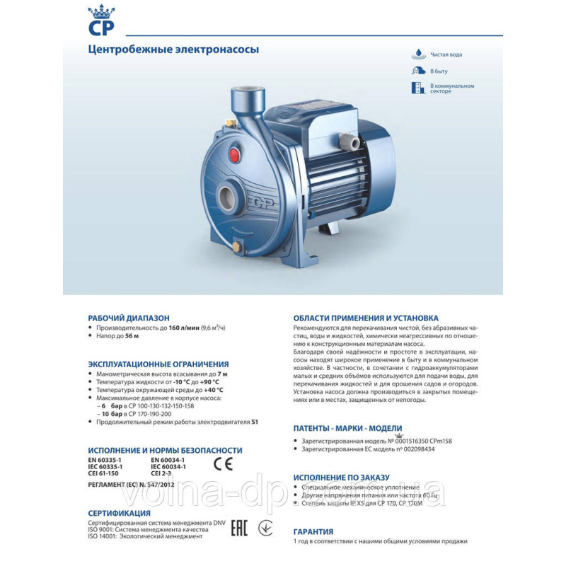 Насосы компании Pedrollo серии CP служат для быстрой перекачки чиcтой воды которая не содержит абразивных частиц или перекачки химически неагресивных жидкостей. Насос центробежный и однофазный, работает от сети 220В. В этой серии вы можете найти насосы с производительностью до 54м3/час и напором до 74м. Корпус насоса изготовлен из чугуна, имеет крышку, рабочее колесо и вал двигателя из нержавеющей стали.