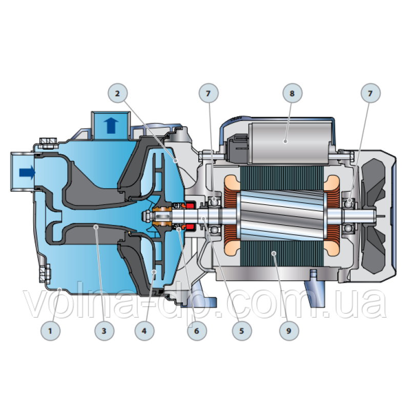 - Робоче колесо, радіальні, відцентрового типу з технополімера Noryl GFN2V "General Electric" (сертифіковано для питної води).