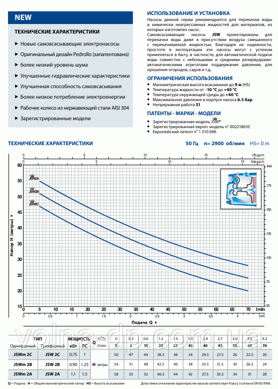 Насосы серии JSW являются самовсасывающими насосами и предназначены для перекачки воды, в том числе при наличии в ней воздуха. Благодаря своей простоте и надежной конструкции они повсеместно применяются в быту, в том числе для подачи воды в сочетании с системами поддержания давления. Насосы применяются для перекачивание воды из колодцев неглубоких скважин, поверхностных источников к потребителю, а также, повышения давления и полива садов огородов.