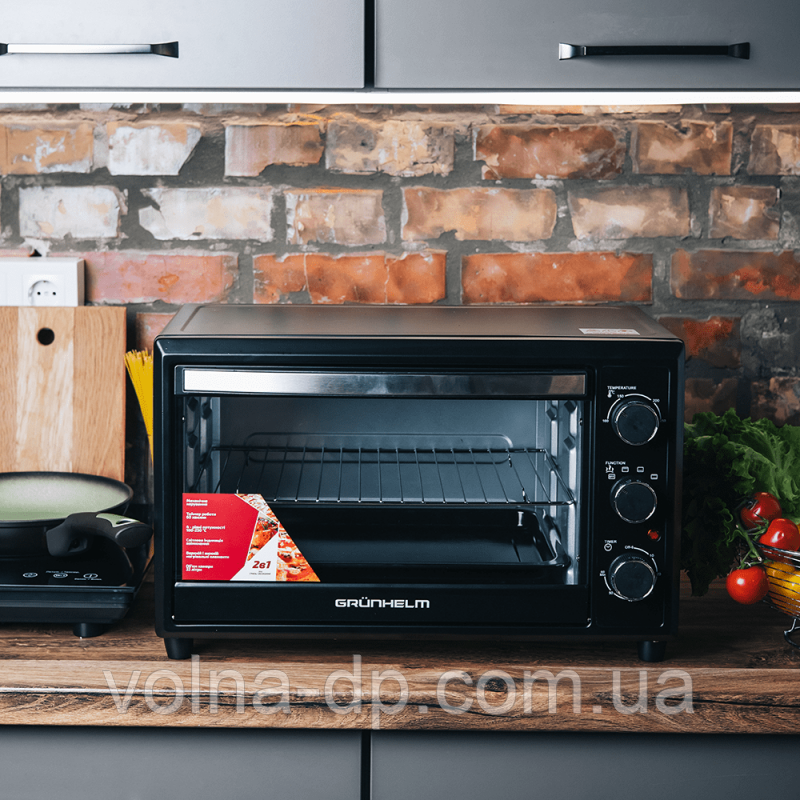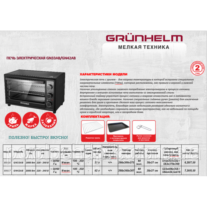 Описание Новая мощная электрическая печь Grunhelm GN33AВ станет верной помощницей в ежедневном приготовлении пищи для всей семьи. Это отличный выбор по соотношению цена/функциональность. ОснащениеБлагодаря режиму конвекции Grunhelm GN33AВ приготавливает любое блюдо значительно быстрее, поскольку нагрев происходит не только снизу, но и со всех сторон. Режим гриль порадует любителей зажаренной золотистой корочки, ведь включив его любое блюдо идеально подрумяниться. Ну, а механический режим управления с помощью поворотных регуляторов максимально облегчает работу аппарата. Световой индикатор зрительно сигнализирует пользователю о работе печи, таймер подает звуковой сигнал об окончании приготовления, терморегулятор контролирует температуру.