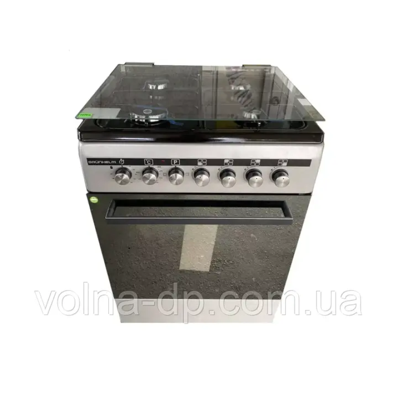 Плита газоелектрична Grunhelm — модель комплектується функцією контролю газу, тому використання цієї моделі буде максимально безпечним і комфортним. На варильній панелі передбачені 4 інноваційні газові конфорки різних розмірів — для комфортного та рівномірного нагрівання посуду різних об'ємів і діаметрів днища. Потужність газового потоку та полум'я регулюють поворотні ручки на передній панелі плити.