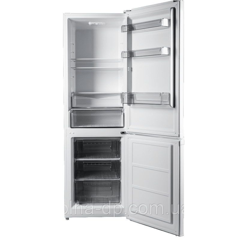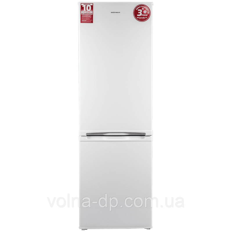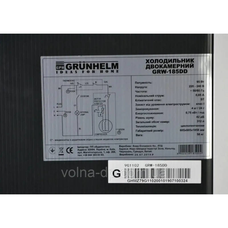 Холодильник GRUNHELM GRW-185DD з двома камерами керується механічно, а система розморожування статична. Загальний об'єм 315 л (з них корисний 312 л) розподіляється 89 л на морозильник і 223 на холодильник. У морозильній камері 3 відділення. У холодильній камері та дверях по 3 полиці. Для овочів є 2 контейнери. Має вбудовані ніжки та вбудовану ручку. По всій камері йде рівномірний розподіл температури стінки з підвищеною термоізоляцією завдяки поліуретановому покриттю. Вироблено на потужностях найкращого китайського заводу No1 за експортом холодильної техніки.