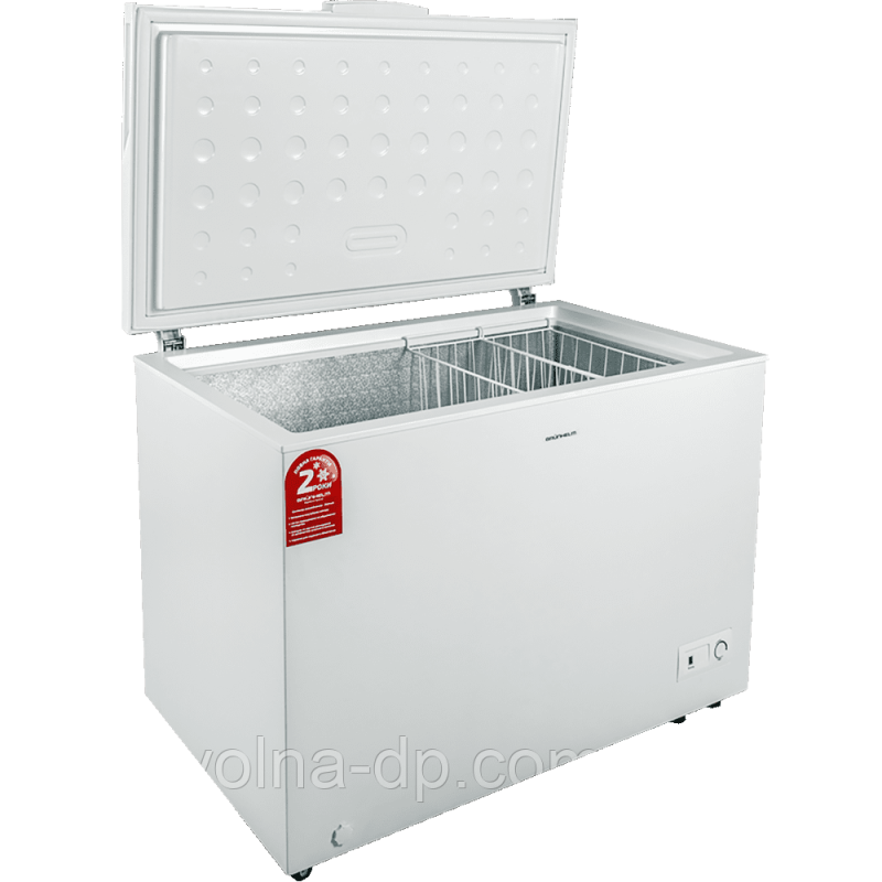 Морозильна скриня GRUNHELM GCFW-300 однокамерний із двома кошиками зі статичним розморожуванням і механічним керуванням об'ємом 290 л, потужністю заморожування 18 кг/добу. Легке пересування на вбудованих коліщатках. Має вбудовані ручки з трьох боків кришки. Швидке та зручне розморожування нижнім клапаном. Безшовна внутрішня камера. Можливість роботи в режимі холодильника. Вироблено на потужностях найкращого китайського заводу No1 за експортом холодильної техніки.