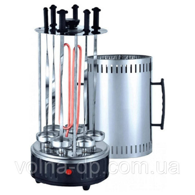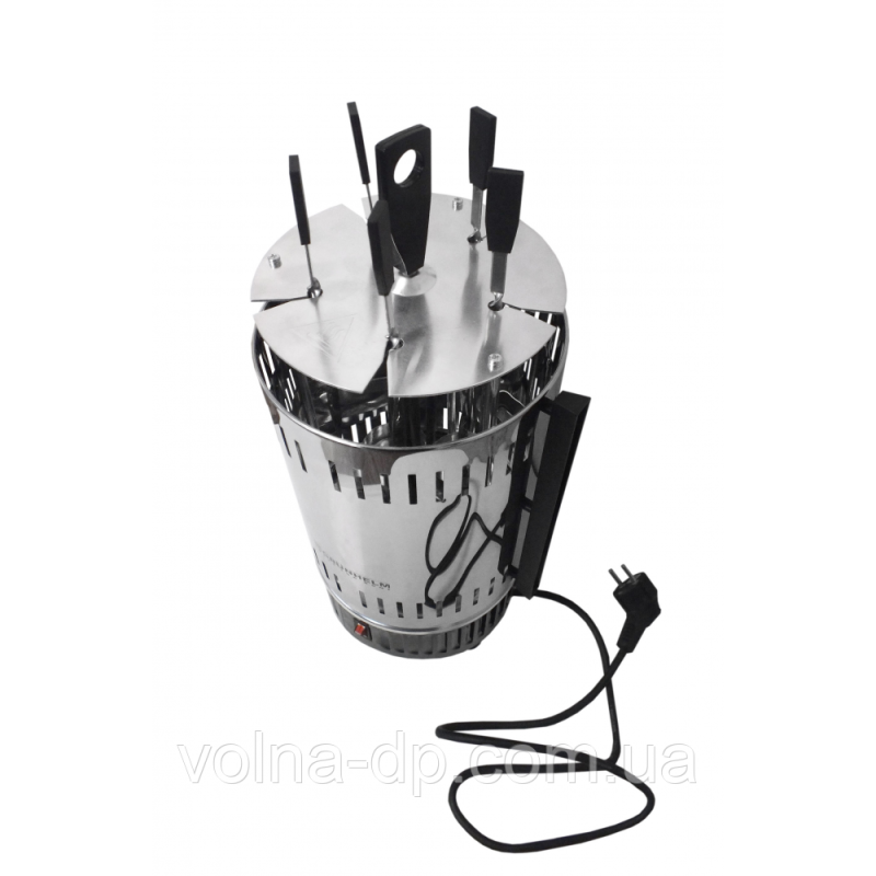 Електрична шашличка має циліндричну форму: у верхній частині знаходиться жарова камера, внизу — пристрій шампурів. П’ять шампурів, що обертаються з чашками для стебел і захисна шкіра забезпечує рівномірне обсмажування шашлика з усіх боків.