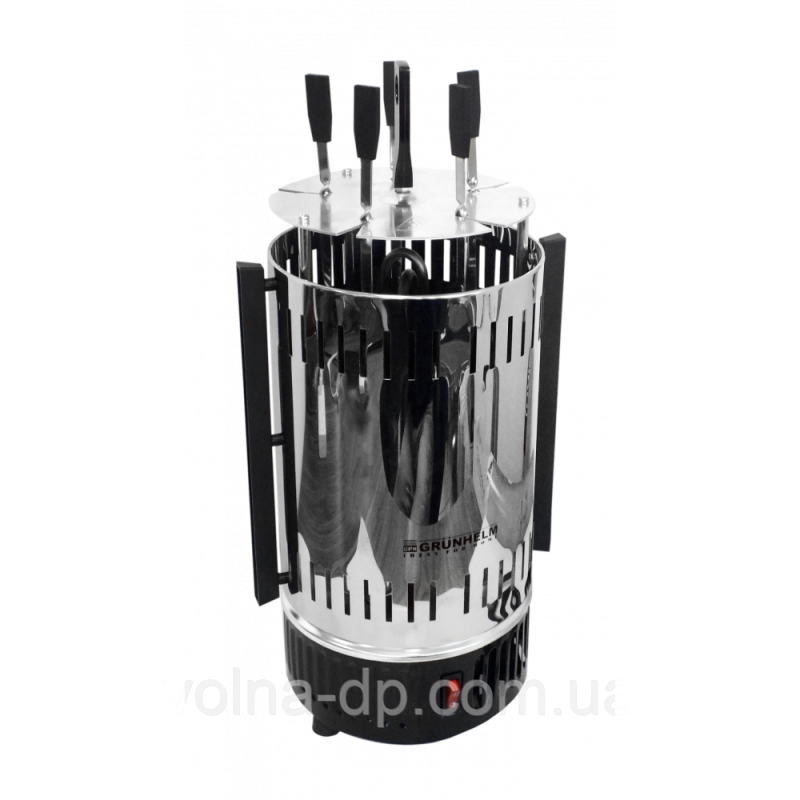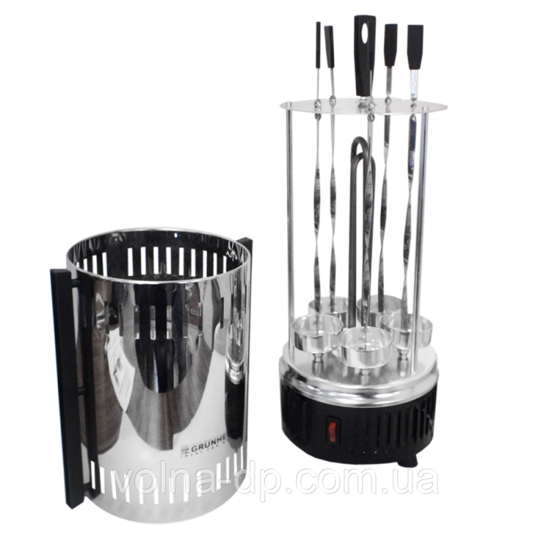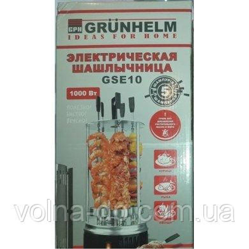 Електрошашоличниця Grunhelm GSE10 - універсальний пристрій, який дозволяє приготувати м'ясний шашлик, люля кебаб, Шашлик з морепродуктів, прямо у Вас вдома. У будь - яку пору року ви зможете побажати себе і своїх гостей смачними стравами. Електрошашлічниця працює від мережі 220В і має оптимальну потужність 1000Вт, а час приготування м'яса становить лише 20 хвилин. Модель Grunhelm GSE10 має циліндричну форму: у верхній частині знаходиться жарова камера, а в нижній — пристрій шампурів. П’ять шампурів, що обертаються з чашками для стебел і захисна шкіра забезпечує рівномірне обсмажування шашлика з усіх боків. Усе, що наводяться вище, — це те, що ви купуєте моделі Grunhelm GSE10 розумним і економним рішенням.