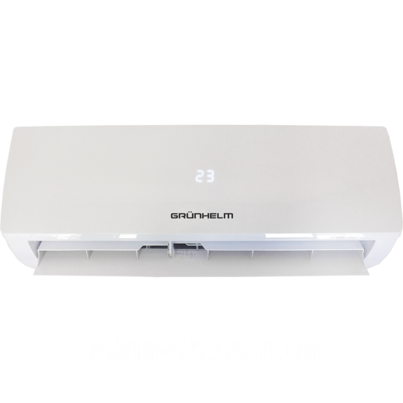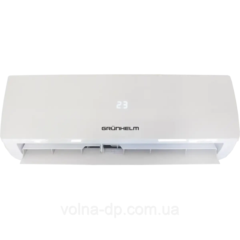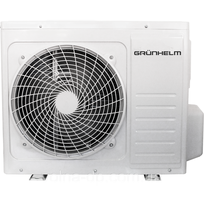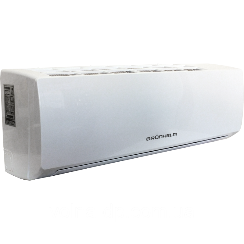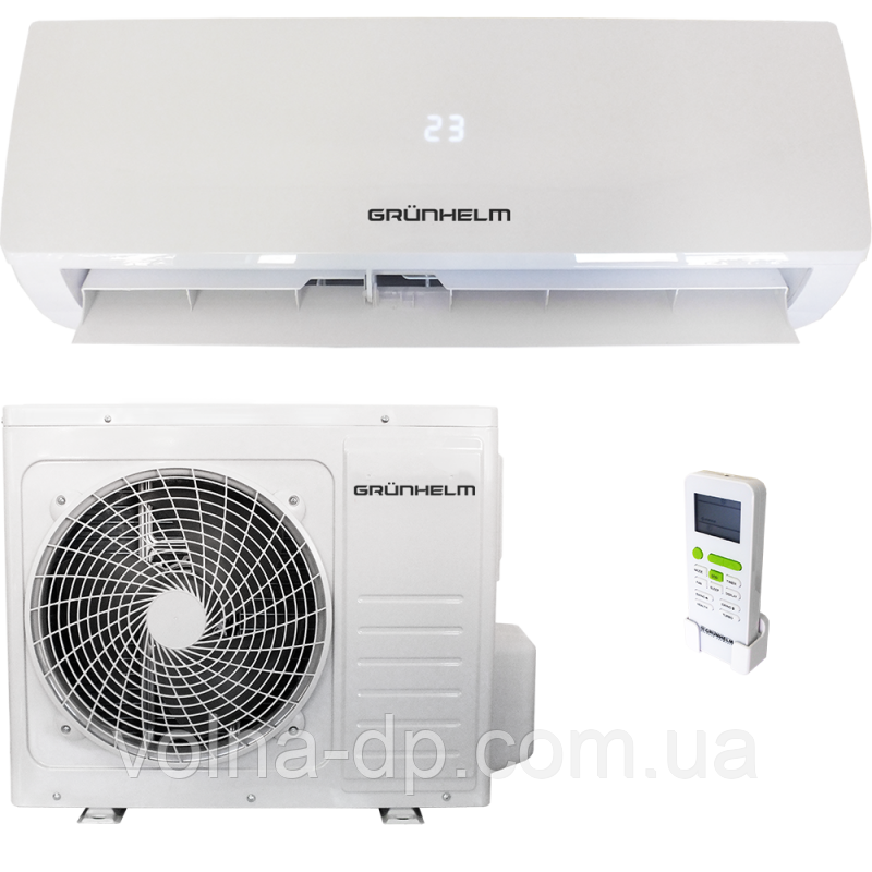 Кондиціонер зі спліт-системі GRUNHELM GAC-09GH настінний і працює від роторного двигуна, який споживає 730 Вт під час обігрівання та 775 Вт у разі охолодження (клас А). Керується пультом, яким можна виставити таймер або режим на електронному дисплеї. У цій системі встановлений якісний компресор GMCC, а довжина магістралі досягає 15 м. Кондиціонер може працювати в режимах охолодження, нагрівання, вентилятора, автоматично осушувати, ЕКО, турборежимі. Серед особливостей варто виділити реперт, самоочищення, запам'ятовування параметрів. Діапазон робочої температури +42/-7 °C, потужність 9000 BTU. Ця модель рекомендована для площі 25 м2.