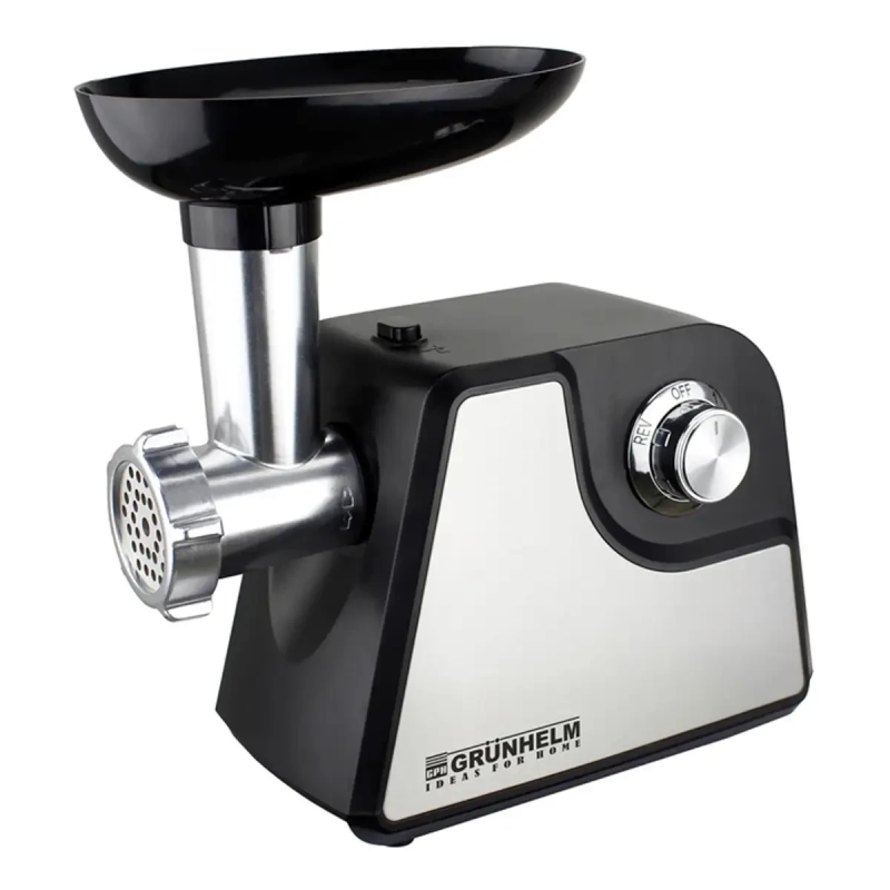 Функціональна і високопродуктивна електрична м'ясорубка, головним чином призначена для побутового використання. Завдяки високої пікової потужності 1800 Вт прилад відмінно справляється з переробкою будь-якої кількості м'яса. Всього за одну хвилину пристрій може справити аж до 1,7 кг однорідного фаршу. А ось комплектації моделі досить скромна — тільки два перфорованих диски для фаршу. Диск з діаметром отворів 5 мм допоможе приготувати дрібний фарш, а для більш крупного помелу передбачена модель з 7-мм перфорацією. Електрична м'ясорубка Grunhelm AMG180SB оснащена функцією зворотного ходу (реверса), яка провертає шнек пристрою у зворотний бік і допомагає витягти застрягле м'ясо і намотані жили. Таким чином можна переробити навіть найжорсткіше м'ясо. Система захисту, що автоматично відключає техніку у випадку застрягання в шнеку кістки. Вага пристрою становить трохи більше 2 кг, тому його зручно пересувати з місця на місце. Керувати м'ясорубкою так само дуже просто: достатньо повернути перемикач на бічній панелі.