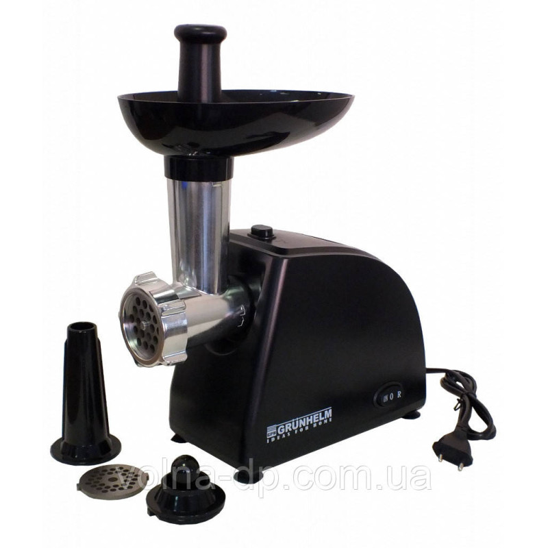 Електрична м'ясорубка Grunhelm AMG140B – надійний побутовий прилад, покликаний на допомогу в такій не простій справі, як приготування фаршу і подрібнення м'ясної продукції. З даної электромясорубкой можна сміливо братися за приготування будь-якої страви і бути впевненим на 100% – воно вам по силам! Потужність мотора становить 1400Вт, чого цілком достатньо для роботи при максимальних навантаженнях. Відмінність електром'ясорубки Grunhelm AMG140B від аналогів полягає в наявності захисту від перегріву і функції реверсу. Таким чином, вибравши м'ясорубку Grunhelm, Ви за цілком прийнятною ціною купуєте надійний і якісний прилад.