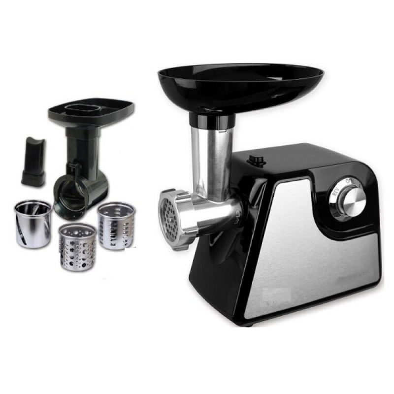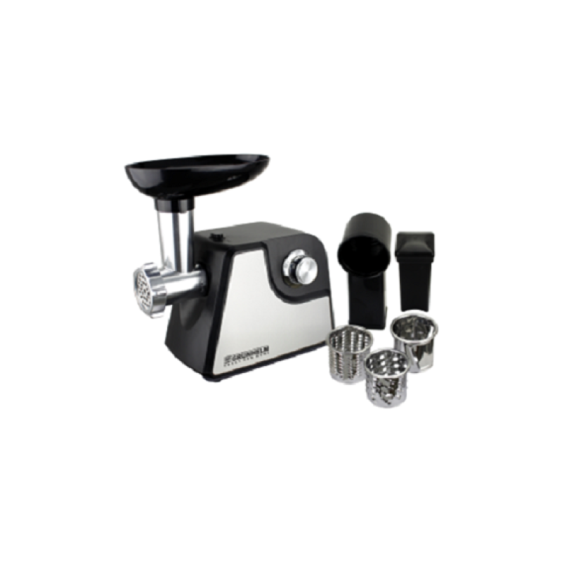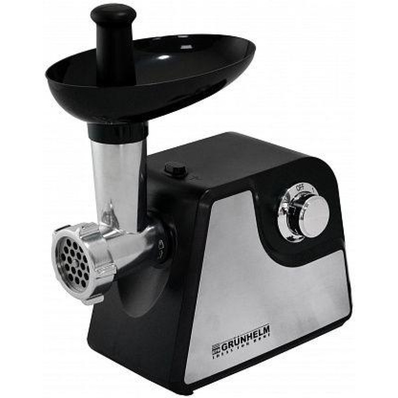 Функціональна та високопродуктивна електрична м'ясорубка, головно призначена для побутового використання. Завдяки високій піковій потужності 1800 Вт прилад чудово справляється з переробленням будь-якої кількості м'яса. Усього за одну хвилину пристрій може зробити аж до 1,7 кг однорідного фаршу. А ось комплектації моделі досить скромна — тільки два перфоровані диски для фаршу. Диск із діаметром отворів 5 мм допоможе приготувати дрібний фарш, а для більшого помелу передбачена модель із 7-мм перфорацією. Електрична м'ясорубка Grunhelm AMG180SS обладнана функцією зворотного ходу (реверсу), яка провертає шнек пристрою у зворотний бік і допомагає витягти застрягле м'ясо та намотані жили. Отже, можна переробити навіть найжорсткіше м'ясо. Система захисту автоматично вимикає техніку в разі застрягання в шнеку кістки. Вага пристрою становить трохи більш ніж 2 кг, тому його зручно пересувати з місця на місце. Керувати м'ясорубкою так само дуже просто: досить повернути перемикач на бічній панелі.