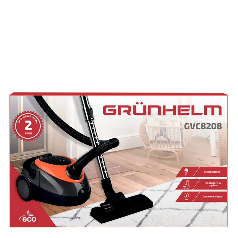 Grunhelm GVC8208 — класичний пилосос для сухого прибирання, обладнаний мішком для збирання пилу, телескопічною трубкою та зручною ручкою для перенесення. Завдяки високій маневровості, компактним розмірам і невеликій вазі, він легко переміщається квартирою та чудово справляється з очищенням будь-яких поверхонь.