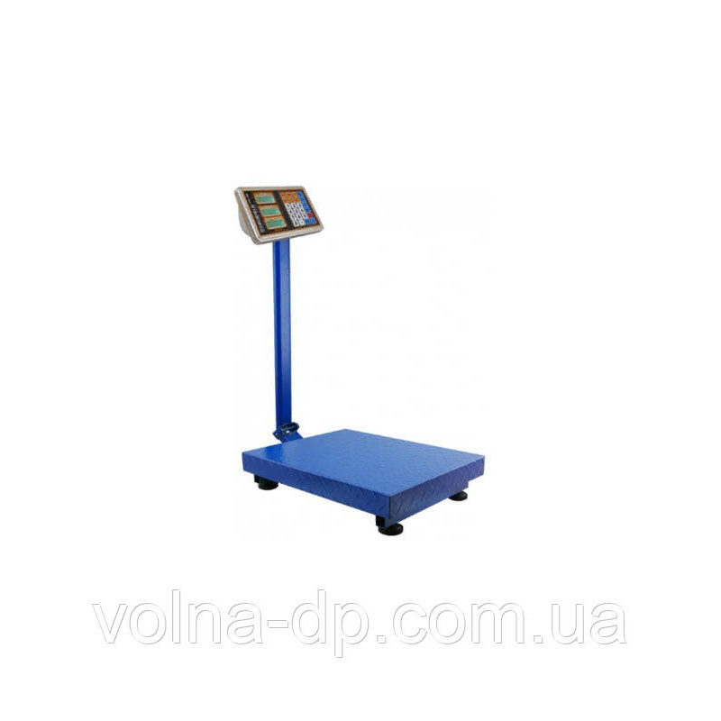 Ваги торговельні підлогові — зручна модель із міцною конструкцією має межу зважування до 150 кг. Рифлений майданчик із розмірами 400 х 300 мм виготовлений із чорної сталі. Ваги працюють від мережі 220 В або від вбудованого акумулятора, без електрики можуть працювати майже 100 годин. Індикатор посилений у залізному корпусі має яскраву дворівневу підсвітку з зображенням