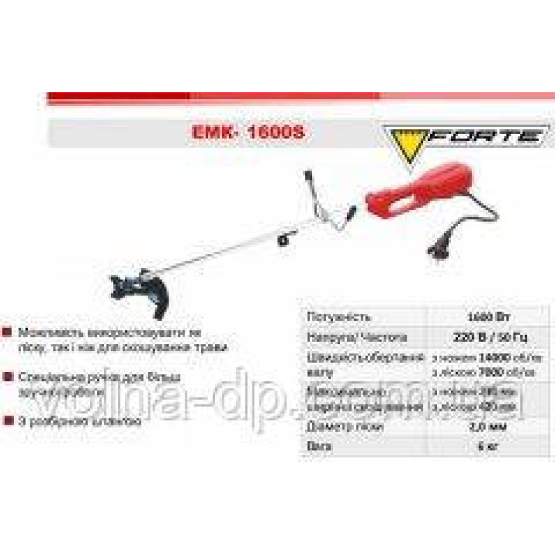 За якісну роботу тримера Форте ЕМК 1600С відповідає безперебійний двигун, його потужність 1600 Вт дозволить безперешкодно працювати не тільки з волосінню, але і з ножем. Сам мотор за рахунок верхнього положення не перешкоджає роботі з мокрою травою, так що навіть в ранню расу чи в дощ працювати з тримером можна.
