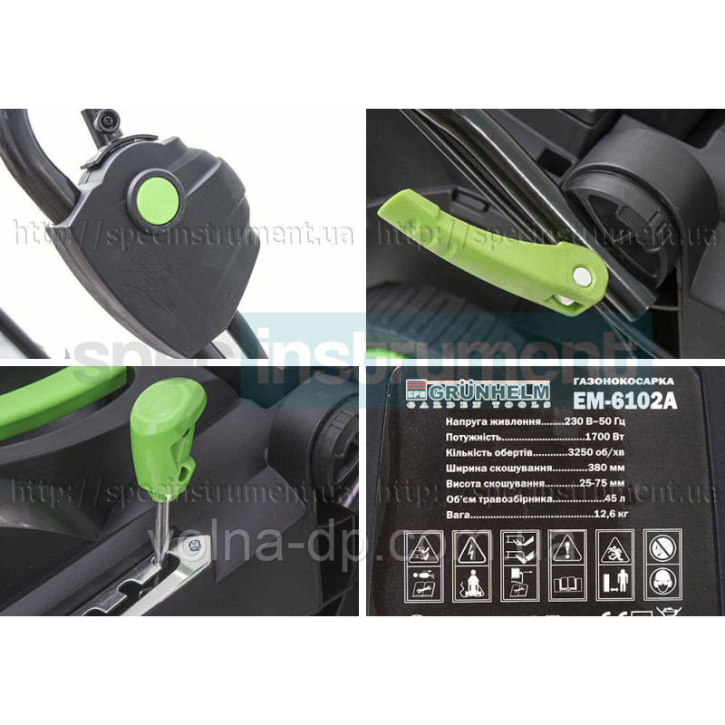 У газонокосарці Grunhelm EM-6102A застосований добре відточений металевої ножик. Внаслідок особливої фігурі закрилок, в ході діяльність формується потужний вихровий протягом, сприяючий високоякісному зрізу трави з подальшим її перебігом у навантажувальну кошик.