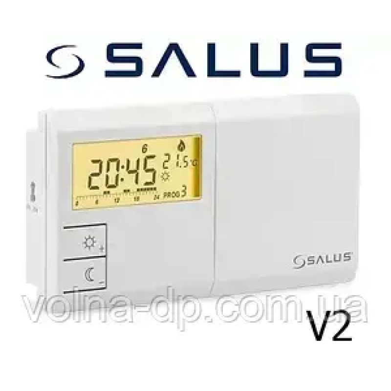 Salus 091FLRFV2 - Поновлена версія популярної моделі 091FLRF з новим приймачем. Пристрій дозволяє встановити два рівні температури: "економний" і "коштовний" у діапазоні від +5 до +30 градусівC з кроком 0,2 °C. На кожен тиждень присвоюється своя програма (таймер), у якій призначаються тимчасові періоди 1 годину для підтримки або "економічного", або "комфортного" режимів. Теоретично можна перемикатися до 24 разів на добу або до 168 разів на тиждень. На будь-який день тижня можна задати одну з дев'яти програм (з них 6 заводських, тобто "жовтко" видавця і 3 користувачів, які можна налаштовувати на власний розсуд. Терморегулятор має безотенційні контакти реле і підходить для роботи з газовими та електричними котлами, практично всіх виробників.