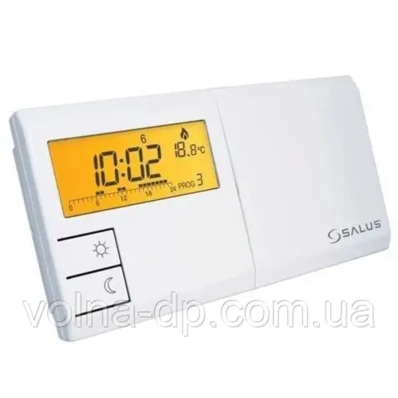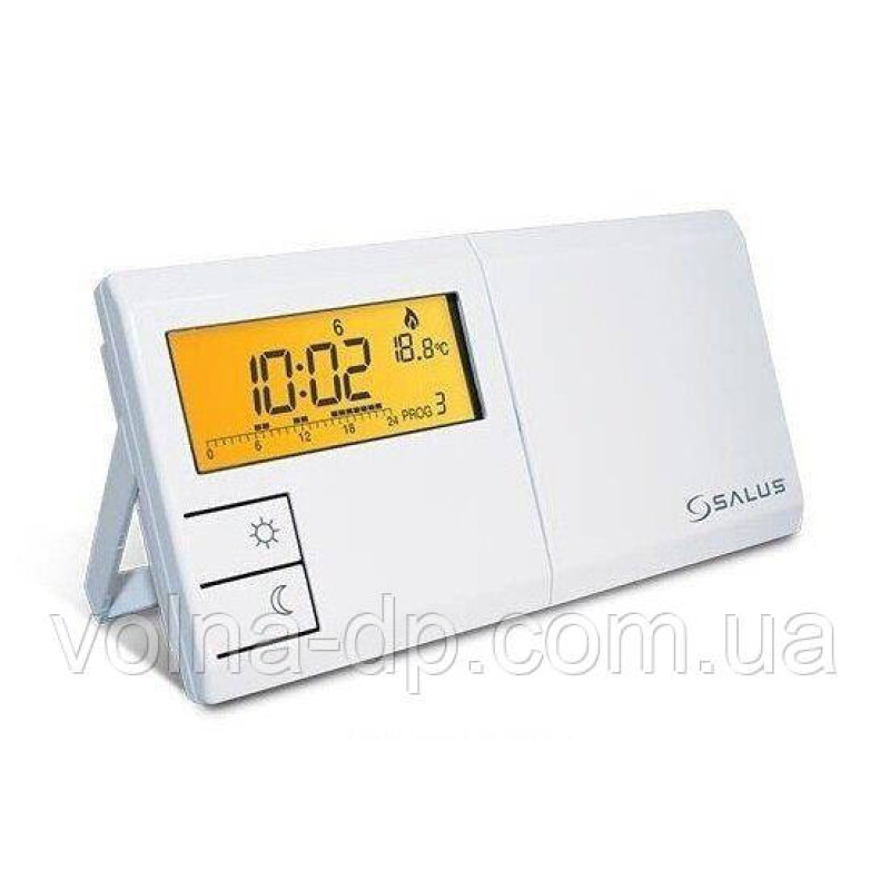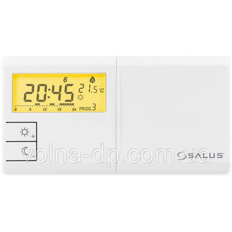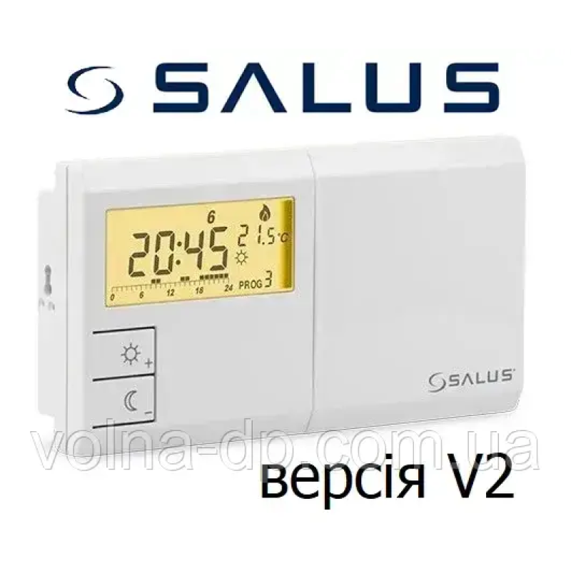 дротовіSalus 091FLV2 - оновлена версія популярної моделі тижневого програматора 091FL. Пристрій дозволяє встановити два рівні температури: "економний" і "коштовний" у діапазоні від +5 до +30 градусівC з кроком 0,2 °C. На кожен тиждень присвоюється своя програма (таймер), у якій призначаються тимчасові періоди 1 годину для підтримки або "економічного", або "комфортного" режимів. Таким чином можна перемикатися до 24 разів на добу або до 168 разів на тиждень. На будь-який день тижня можна задати одну з дев'яти програм (з них 6 заводських, тобто "жовтко" видавця і 3 користувачів, які можна налаштовувати на власний розсуд. Терморегулятор має безотенційні контакти реле і підходить для роботи майже з усіма марками котлів.