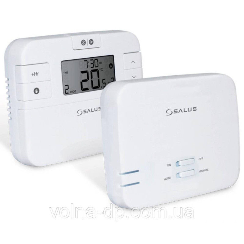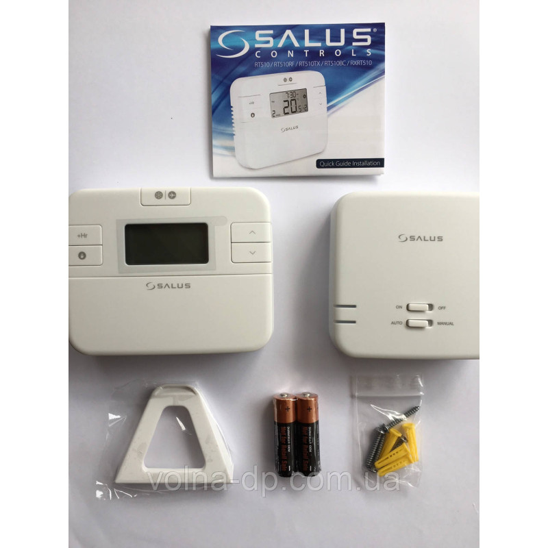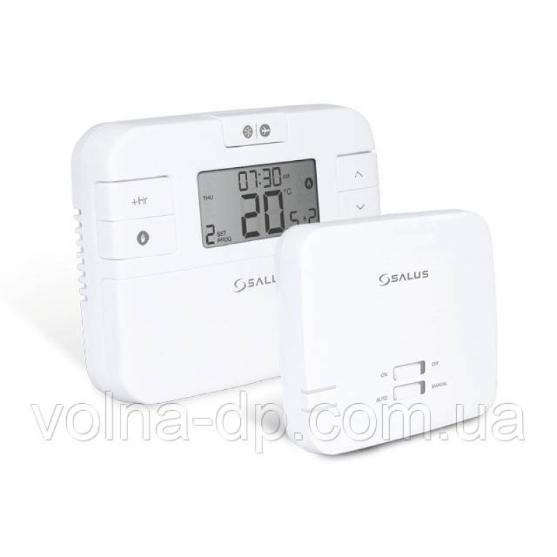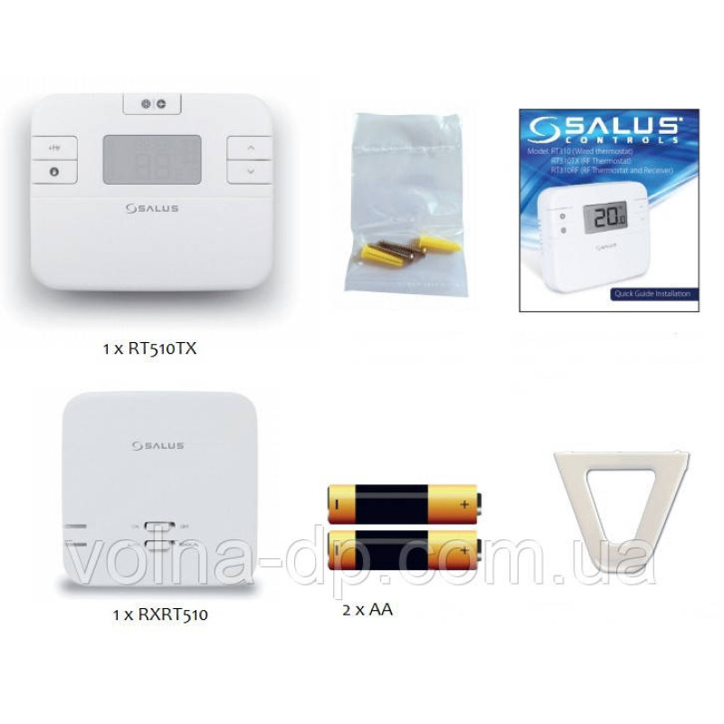 Заміна моделі RT500RF. Властивості: Унікальність комунікаційних кодів. Частота роботи 868 MHz забезпечує безперебійну роботу пристрою. Термостат з приймачем пов'язані один з одним за замовчуванням. Програмування 5+2 або 24 год. (6 періодів на добу). Ручний або автоматичний режим - перемикання однією кнопкою. Тимчасової ручний режим - до 9 годин. Тимчасової ручний режим (задана Вами температура буде підтримуватися до настання у програмі наступного періоду). Режим Захисту від замерзання. Можливість регулювання темп. Захисту від замерзання 5-17ºC. Режим Відпустку. Сплячий режим (зупинення всіх функції терморегулятора). Чіткий екран з меню в графічній формі, з підсвічуванням. Підставка для термостата в комплекті. 5 років гарантії. Технічні характеристики: Живлення термостата - 2 x батареї AA. Харчування пприемника - 230V AC. Макс. навантаження приймача - 16 (5) A. Вихід - реле NO/COM. Гістерезис +/-0,5 або +/-0,25 ºC. Індикація темп. з точністю до 0,5 або 0,1 ºC. Коригування вимірюваної темп. +/-3ºC. Діапазон регулювання темп. - 5-35 C. Розміри термостата [мм] - 120 x 96 x 27. Розміри приймача [мм]- 96 x 96 x 28.